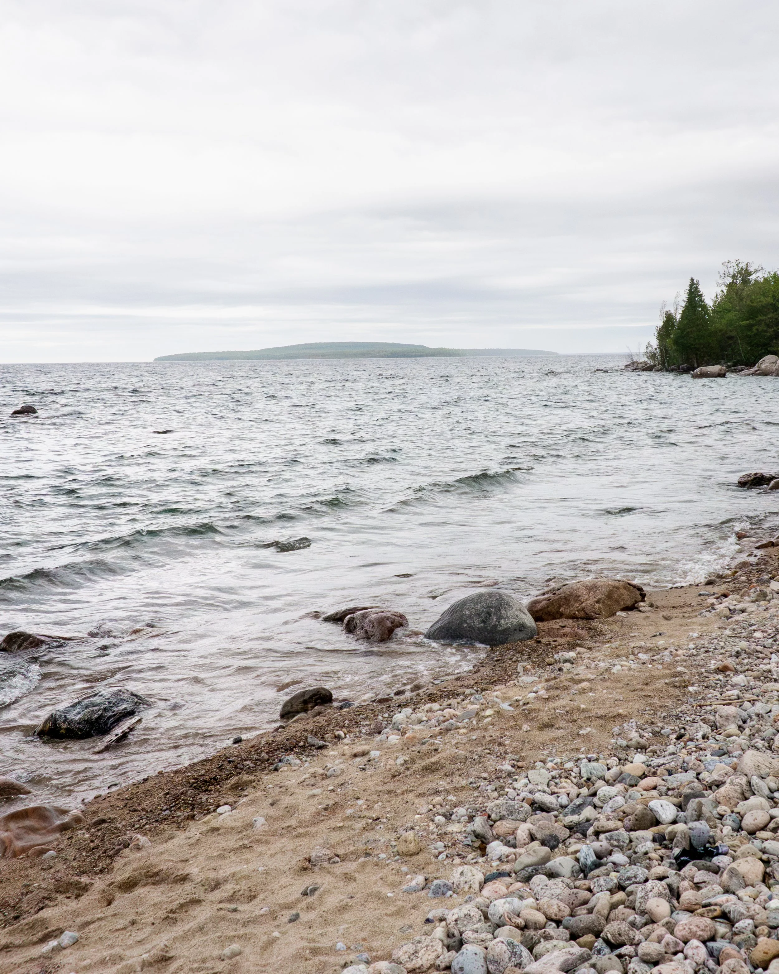 We were only at the park for one night and the rain continued on the next morning, so we did not get to explore the hiking trails sadly. We decided to head over to one of the beach areas after we packed up. The drive was wonderful. We drove through windy forested roads that lead to a very organized one-way entrance, with a road that loops all the way around the beach. This loop contained different parking lot areas. We found a spot at the very first lot, since it was gloomy and drizzling, and there were barely any people there. We didn’t let the weather stop us from admiring all of the beautiful rocks and driftwood by the water. The beach itself was quite lovely, as it was surrounded by forest, and provided lovely views in the distance.